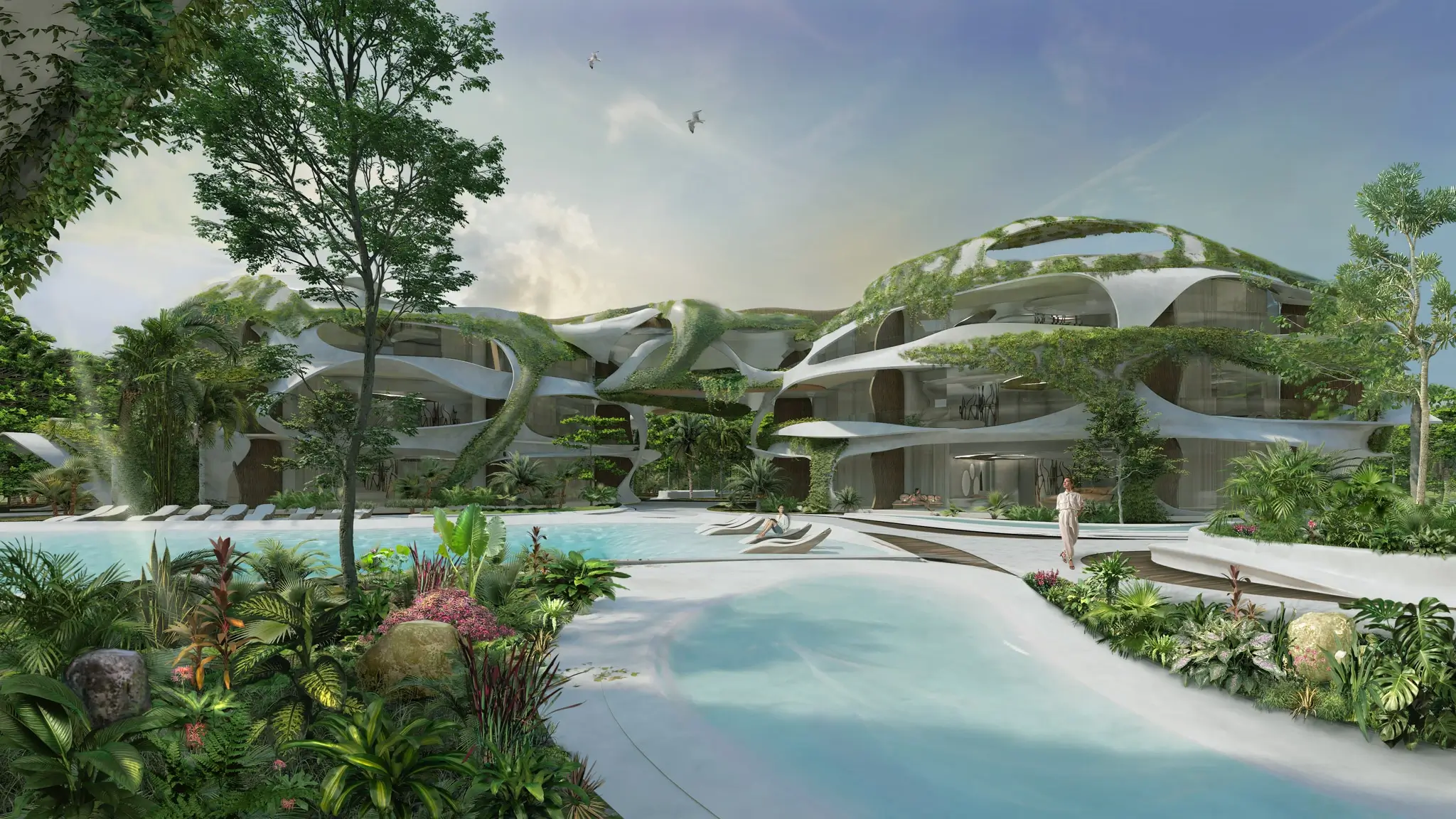The AZULIK Residences architecture seeks to awaken reflection, maintaining its philosophy by integrating biomimetic shapes, hand-made details, and establishing a permanent dialogue with nature. The volumetry is always in continuous movement. The architectural design avoids lines and straight angles to establish the idea of continuous fluidity. At the same time, concrete finishes merge various construction techniques and artisan approaches that give the feeling of carved stones, whose volumes and shapes vary, but always integrated harmoniously in these habitable sculptures. The interiors are free and flexible, always adapting to different needs, playing with light and the views. The building’s configuration is designed so that each residence has a different view of the jungle and is fully integrated into the circular and interconnected masterplan.