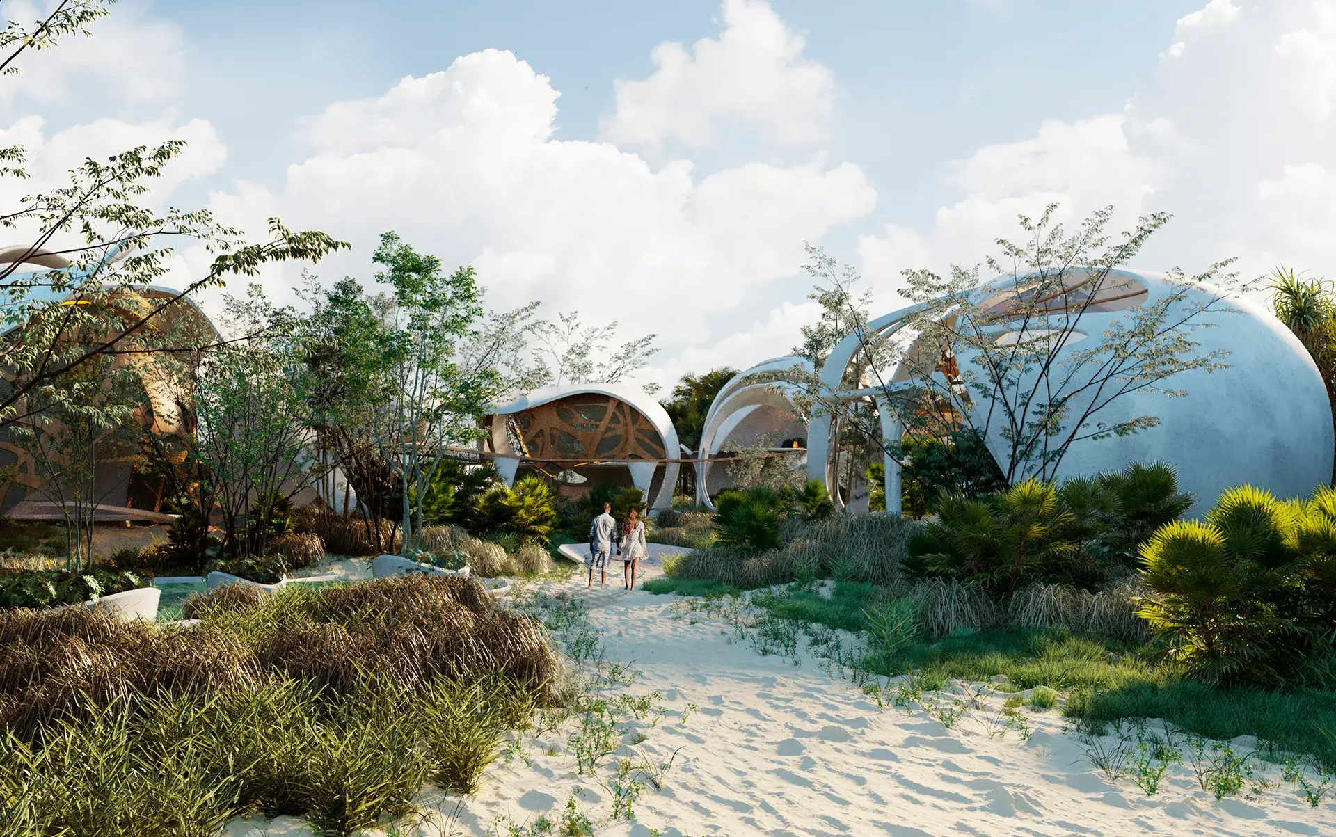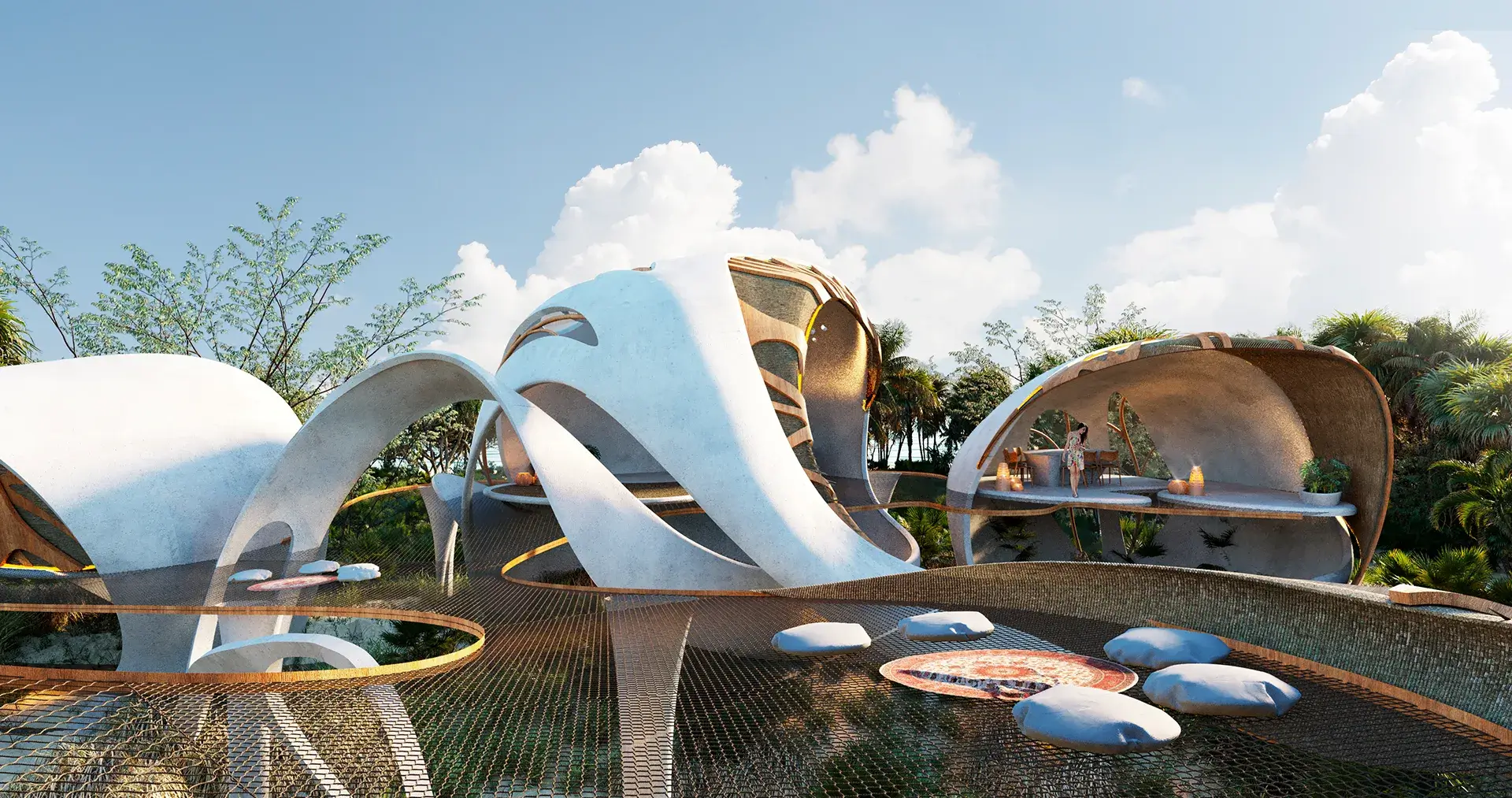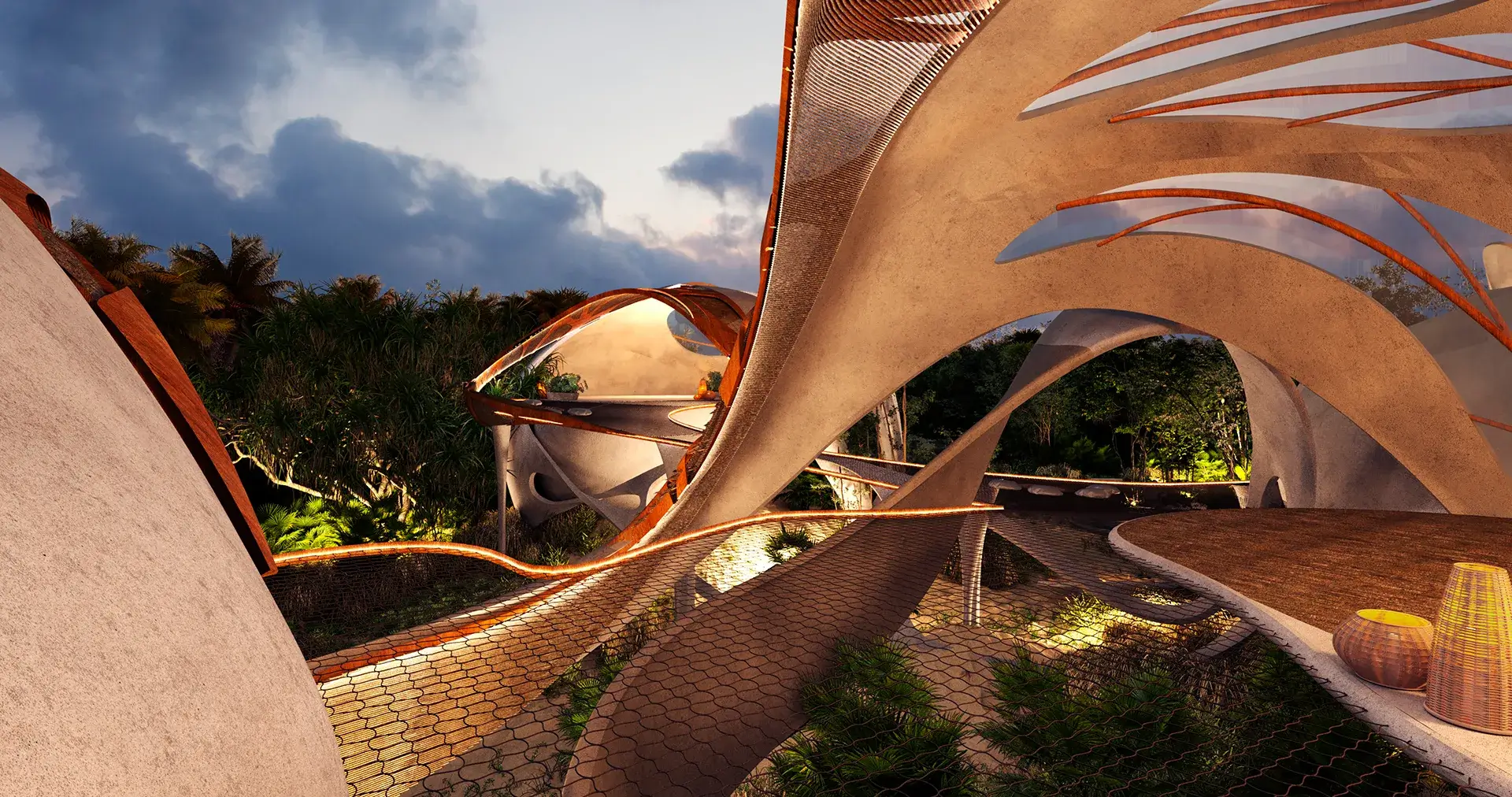Encompassed within the natural landscapes of the Sian Ka’an Biosphere, we’ve built a joined set of two private villas: a main and guest house. Flowing with a biomimetic design, this space displays organic forms of concrete with an opening to the outdoor spaces and interconnected communications that allow the preservation of the flora and fauna of Sian Ka’an, boosting the enjoyment of the natural surroundings.